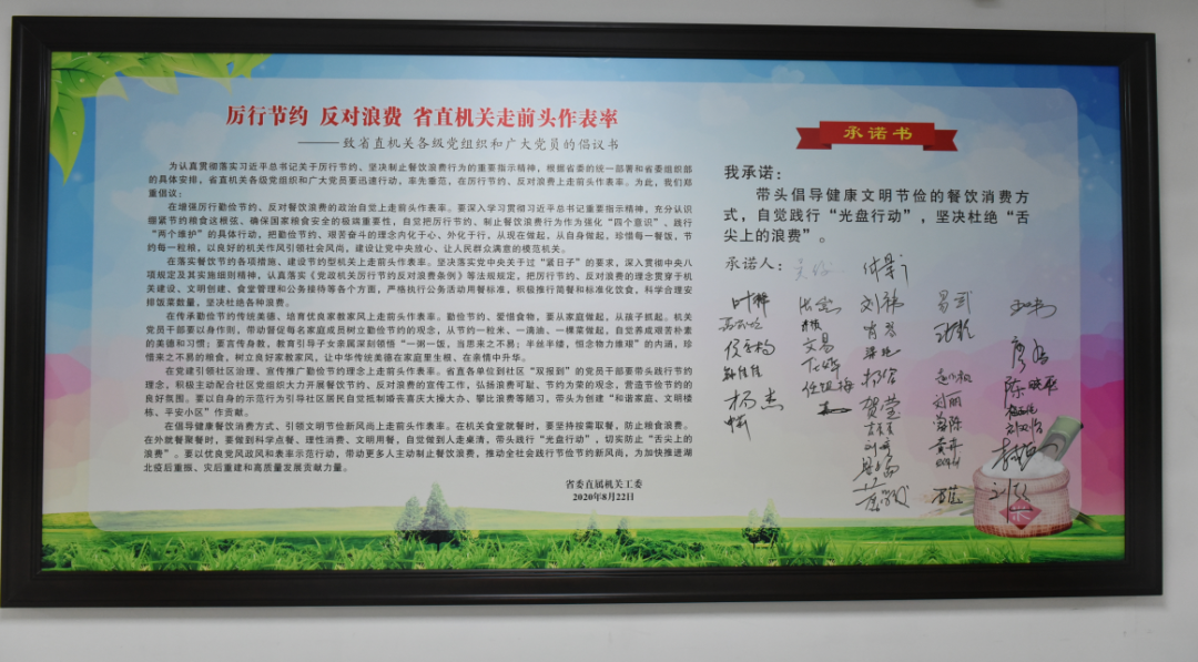 一是加强宣传、注重引导,不断增强全局干部职工的节约意识。通过局微信工作群传达中央和国家机关工委《公开信》、省委直属机关工委《倡议书》精神,并将《倡议书》印发至每一名党员;在食堂显著位置张贴、摆放节约食物、杜绝浪费的宣传画、提示语,教育引导党员迅速行动、以身作则,时刻牢记“四个带头”和“五个走前头作表率”要求,自觉做厉行节约、反对浪费的先锋和表率。